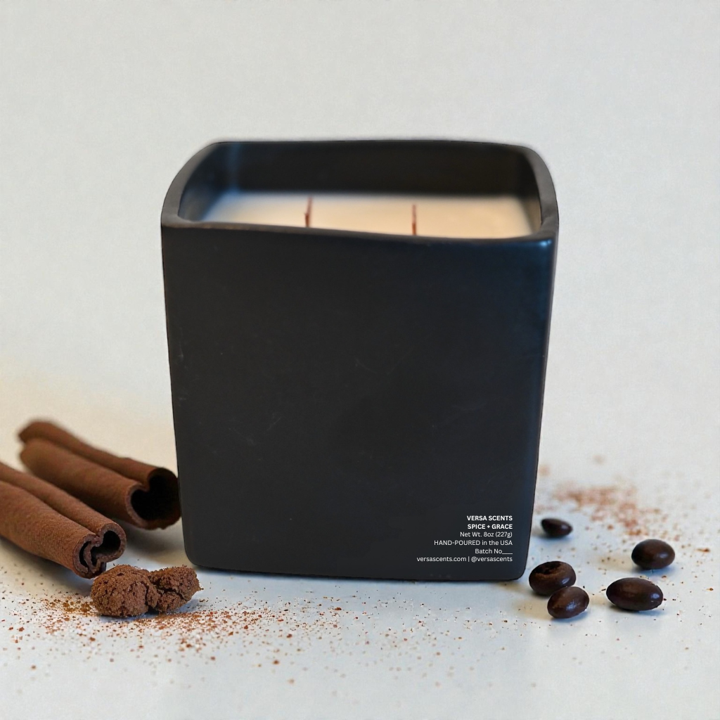 Spice + Grace opens softly—gentle clove and cinnamon rising first, warm but never sharp. There’s a quiet sweetness beneath it, subtle and smooth, carried by creamy undertones that feel comforting rather than indulgent.