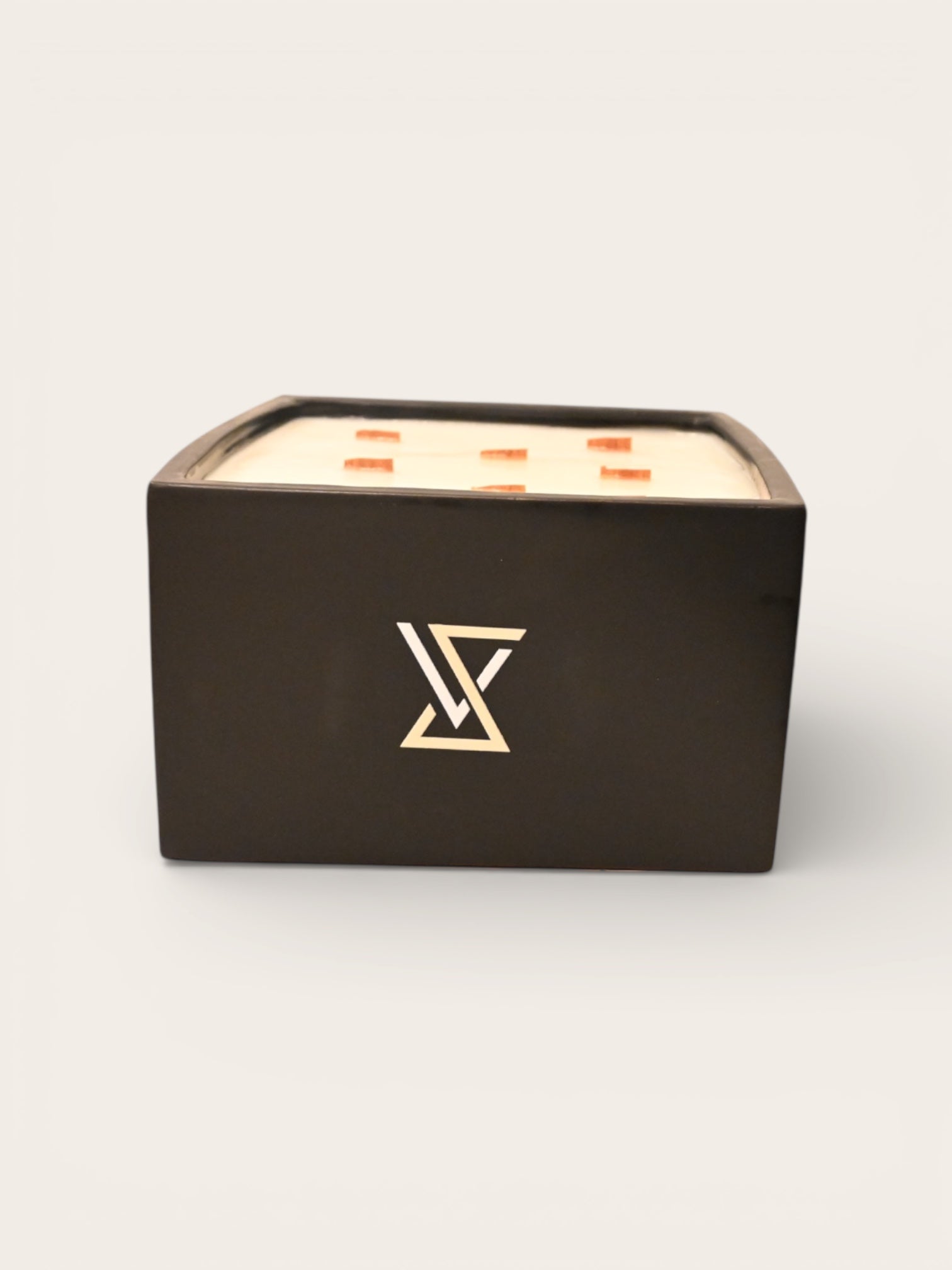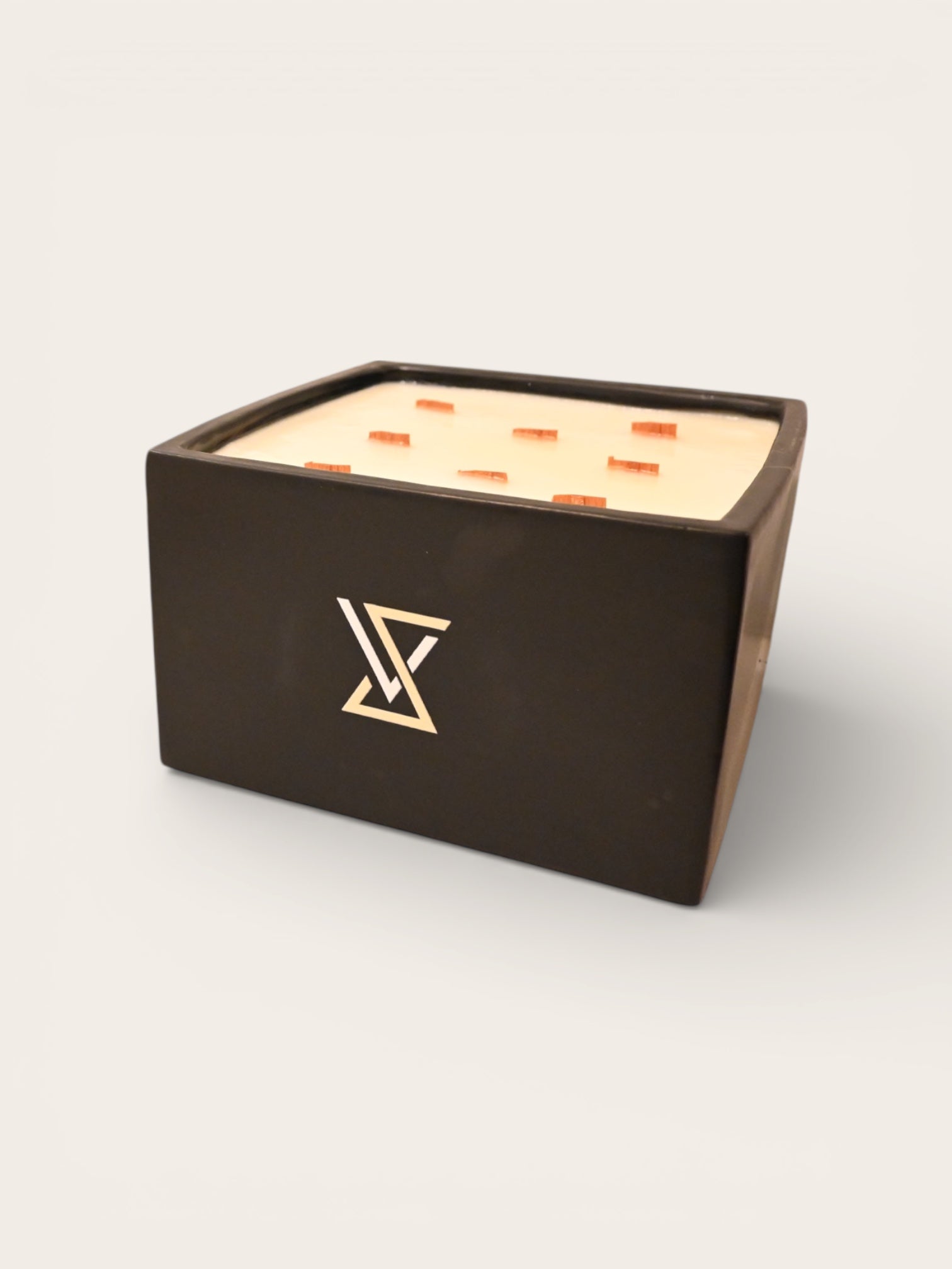 Hand-poured with 130 oz of premium wax and finished with eight wooden wicks for a clean, expansive burn. Housed in a sculptural matte black ceramic vessel designed to live on display.